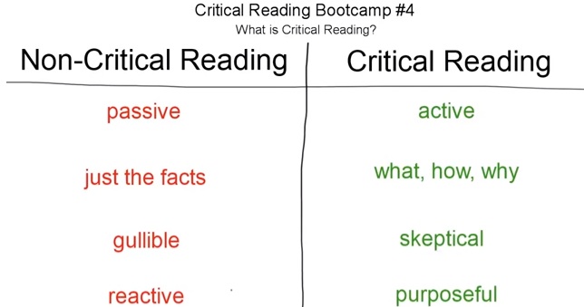 In several video posts from Robert Schombs, viewers are introduced to critical reading and strategies to effectively use this close reading method. In the post here, Schombs juxtaposes critical reading and non-critical reading as illustrated in the graphic below. In a second post (here), Schmobs explains how students often engage text by skimming and how close reading enables students to more accurately interact in text. As he notes, “Every word counts and sometimes a SINGLE word makes all the difference.”