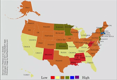 In a video presentation posted by Pop! Tech Amandy Ripley describes her effort to solve a mystery. The mystery? Why are US educational outcomes mediocre relative to other countries. To make her point, she posts the map below.