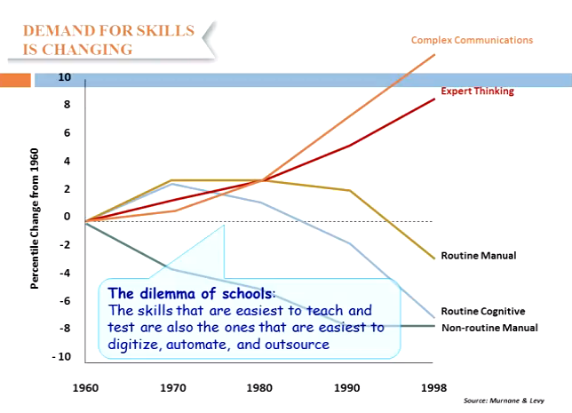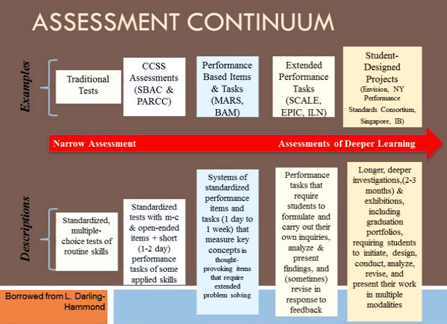 In a presentation before the Maryland State Education Association, Stanford professor Dr. Linda Darling-Hammond and University of Southern California professor Dr. Morgan Polikoff overview the Common Core State Standards and contextualize previous state standards and assessments. Certainly worth watching the entire discussion or, at the very least, hearing Hammond and Polikoff talk about the two PowerPoint slides below. First Hammond, at minute 3:40, explains how the skills in demand have changed over time and at minute 19:07 Polikoff describes the continuum of narrow to deeper assessments. You can see the entire presentation here.